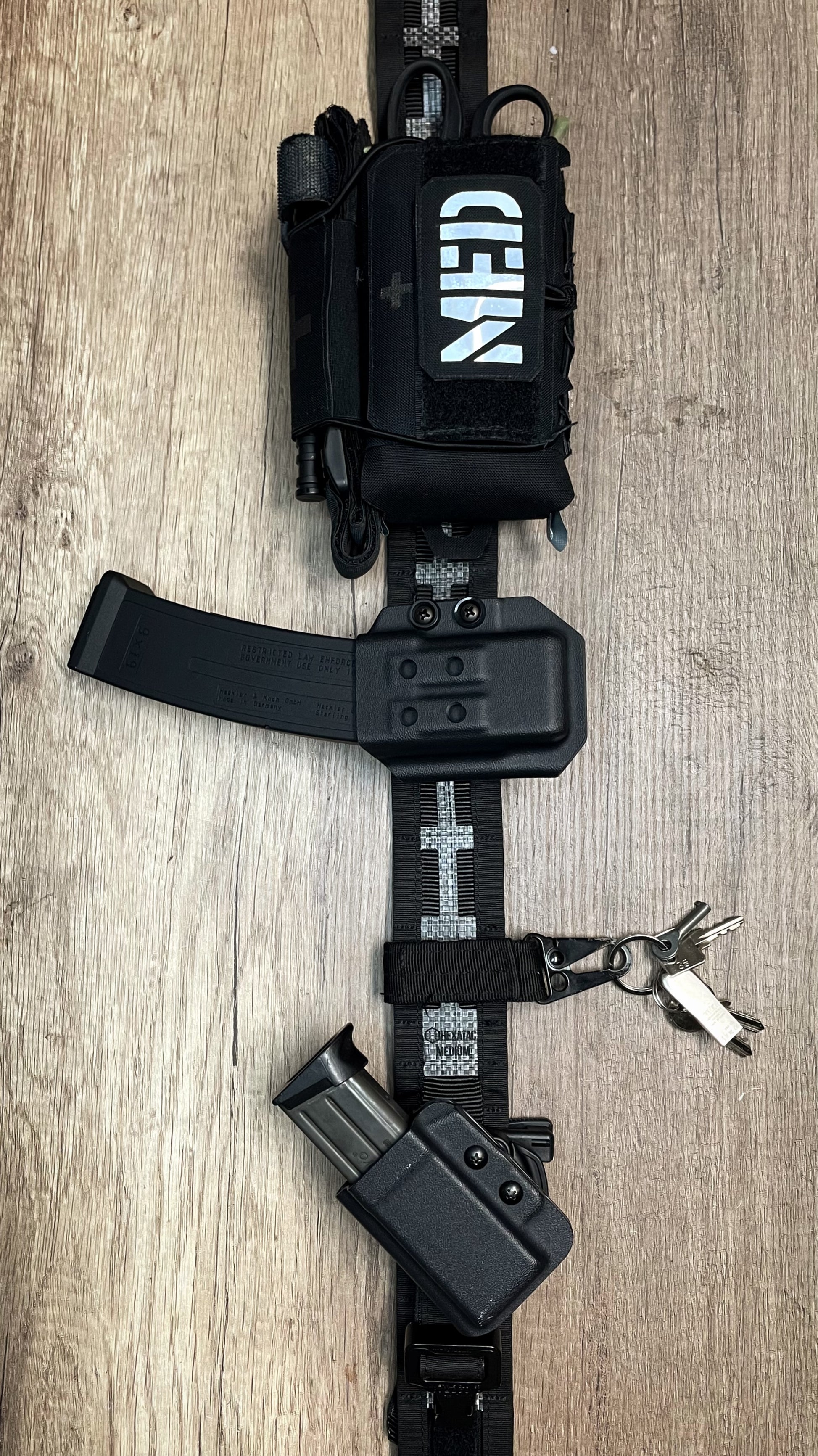 - Il peut être fixé a votre ceinturons ou votre gilet tactique sur des passants molles et accompagné du système Tech Mount mini (bladetech), il sera orientable a 360° et amovible en un clic.